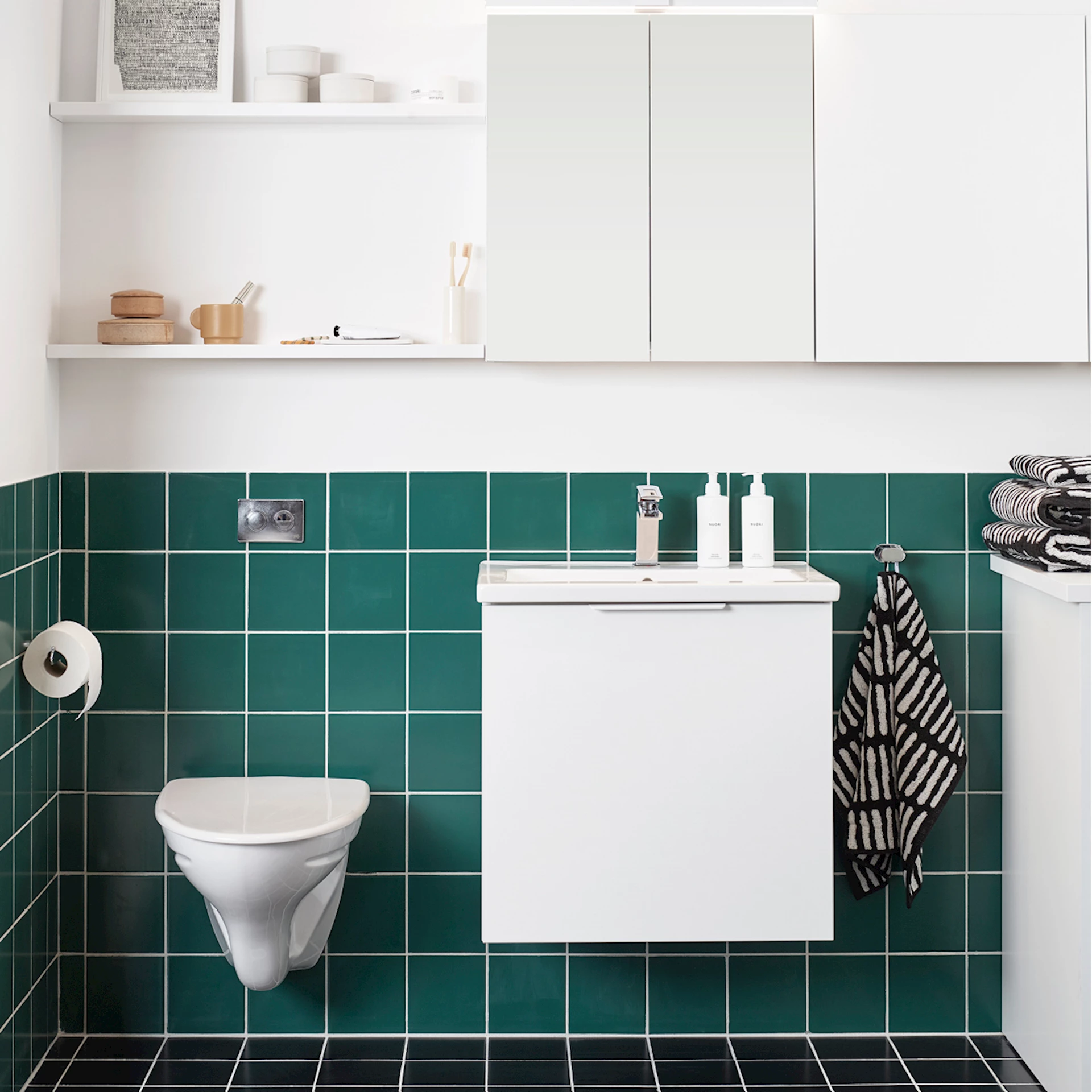 På bad som er mindre enn 5 kvadratmeter er det de plassbesparende løsningene som gjelder! Toalett som bygger minst mulig, smale baderomsmøbler (det er også mulig å velge møbler med dybde 35 cm), dusj med foldedører som kan slås inn når den ikke er i bruk, god belysning og speilskap som gir følelsen av et større rom.
